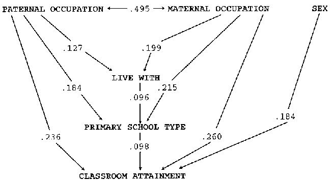 Secondary schools: Regressions undertaken at the secondary level showed a different picture than the primary schools - especially because of the stratification of secondary schools and the different social class profile of the distinct types of secondary school. Variables used in these stepwise regressions included sex of child, occupation of father, occupation of mother, type of secondary school attended, pre-school attendance, with whom the child lived and who helped the child with homework. Using CEE scores as the dependent variable a massive 56.5% of the variance was accounted for; the main contributions to this variance were type of school - sixth form or not (44%), occupation of mother (12.2%), occupation of father (2%), sex of student (0.7%), and with whom the child lives (0.6%). Using the standardised end-of-term scores as the dependent variable, the explanation of variance was much more limited: only 6.8% of the variance was accounted for - and the sole contribution was made by the sex of the student. Finally, the raw end-of-term scores were used as the dependent variable and 14.5% of the variance was accounted for; the main contributions to the variance were type of secondary school (7.5%), attendance of pre-school (3.1%), sex of student (2.9%) and occupation of father (1.1%). Figure 4.1.2 displays how the correlations between these significant variables contribute to classroom attainment.