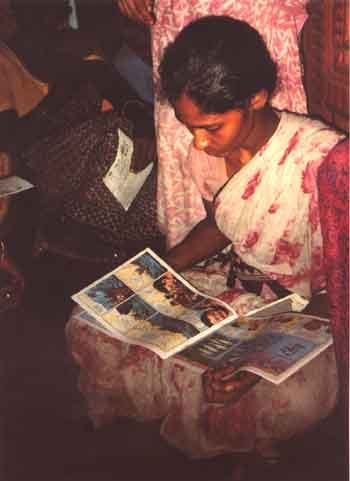 Visual literacy: Such projects, outside the traditional paradigm, suggest that we may need to look at ILT and PL in a new light. We also note the increasing interest in visual literacy - the ability to decode and interpret drawings or pictorial symbols or colour codes rather than letters and words and sentences. Visual literacy relates in part to interpreting the signs and symbols in the social environment (e.g. signs on toilet doors, house styles on transport, political symbols etc). Another form of visual literacy is making meaning out of forms such as medical cards and passport applications, in which texts, boxes and spaces are arranged in a specific way; understanding of how to fill them in needs to be developed. But the main use of such material is probably the use of drawings to communicate messages in ILT and PL and extension programmes (e.g. Storyteller in South Africa; BOBP in Asia etc: see ODA 1994 pp31-38). In particular, the use of so-called 'comic books' appears to be growing to engage the attention of the users and to get messages across, especially in health. And in Thailand, some innovative projects in post-literacy using radio and video have been commenced (World Education corresp).