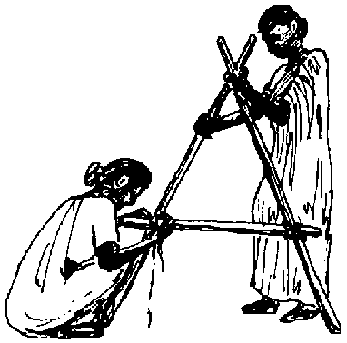 STEP 1 Tie the poles very tightly together to make the shape of a letter A. Hang the stone from the top of the A-Frame, making sure the stone hangs below the cross bar. STEP 2 Holding the frame upright, mark with two sticks exactly where the poles touch the ground. When the stone stops moving, mark where the string crosses the cross bar. Turn the A-Frame around, placing the poles in exactly the positions marked by the two sticks. Again mark where the string crosses the cross bar.