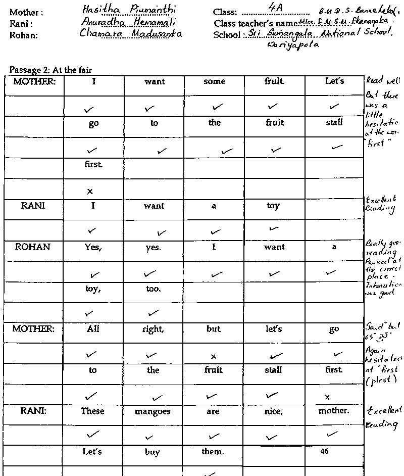 The task comprised of an illustration, taken from a reading book in for ten year old children in Sri Lanka - Lets Go to the Fair. The illustration is of a mother and her two children buying fruit from a fruit stall. The selected students were to look at the illustration and talk about it.