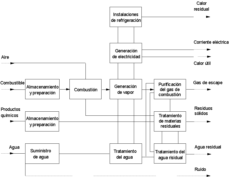 A-1 Central térmica con indicación de los flujos de energía y de material de relevancia ambiental (esquema)