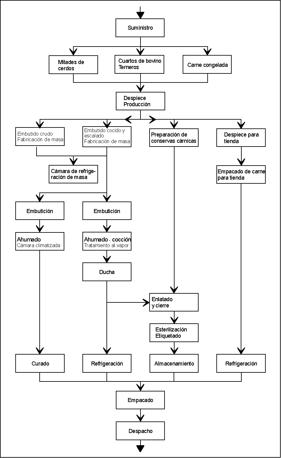 Despiece de las canales - picado de la carne - adición de condimentos - embutición de la masa en tripa natural o artificial - tratamiento térmico - refrigeración - despacho - preservación - fabricación de conservas.