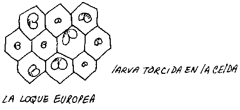 La loque europea causa la muerte de la larva antes de que se selle la celda, y así la larva muerta está a la vista. Larva matada por la loque europea varia en color de blanco a marrón y está torcida en la celda.