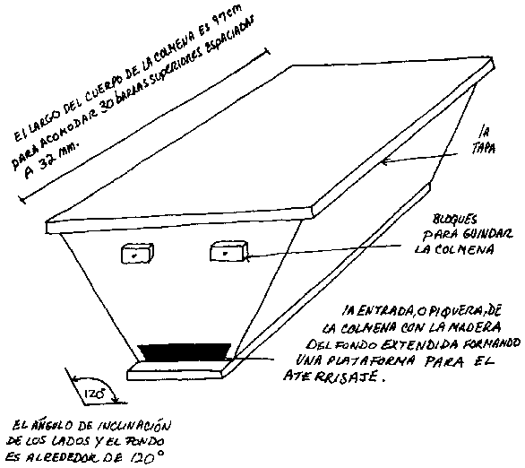 La colmena KTBH (medidas en cm, usando madera de 1.9 cm)