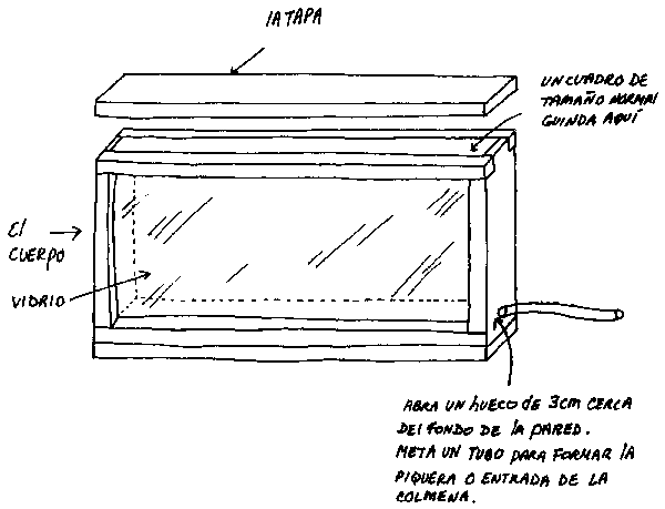 La colmena se puede cubrir con una tapa de las mismas medidas que el fondo, o varias cajas se pueden poner una encima de la otra. Acuérdese de dejar un espacio de tránsito alrededor del cuadro.
