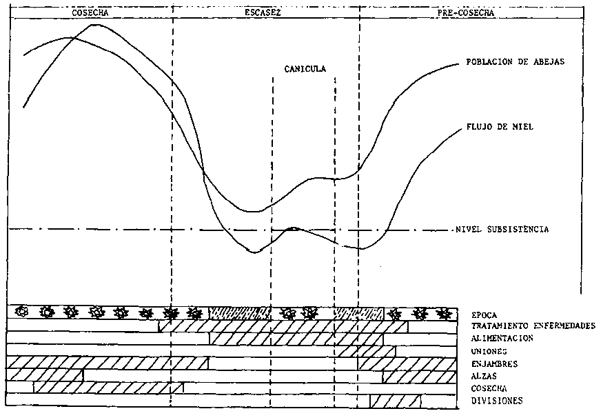 Durante la escasez, la gráfica muestra que el apicultor debe alimentar a las abejas, porque esta es la época cuando hay pocas flores para alimento natural.