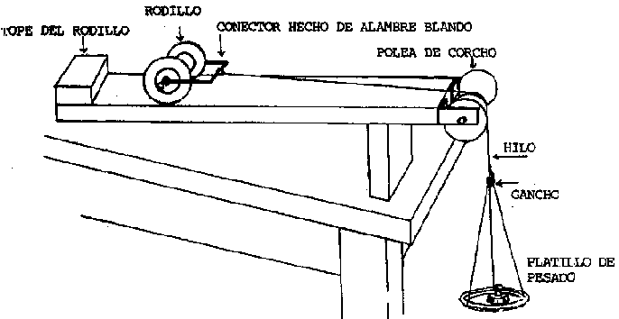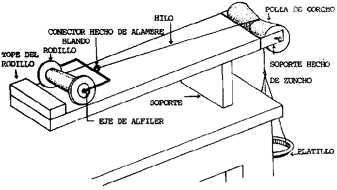 5. Se puede fabricar un platillo de pesado con pedazos de hojalata (por ejemplo, de la topa de una lata de querosén). Use hilo y un gancho liviano, fabricado con un alfiler recto, para unir el platillo de pesado a la estructura del rodillo.