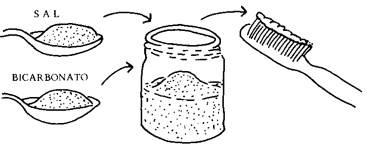 Mezcle un poquito de sal y bicarbonato en igual cantidad, y use esto en su cepillo. Para que se pegue al cepillo, moje el cepillo antes de meterlo en el polvo. Sal y bicarbonato sirve igual que la pasta dental para lavarse los dientes. Si no tiene bicarbonato, use solamente sal.