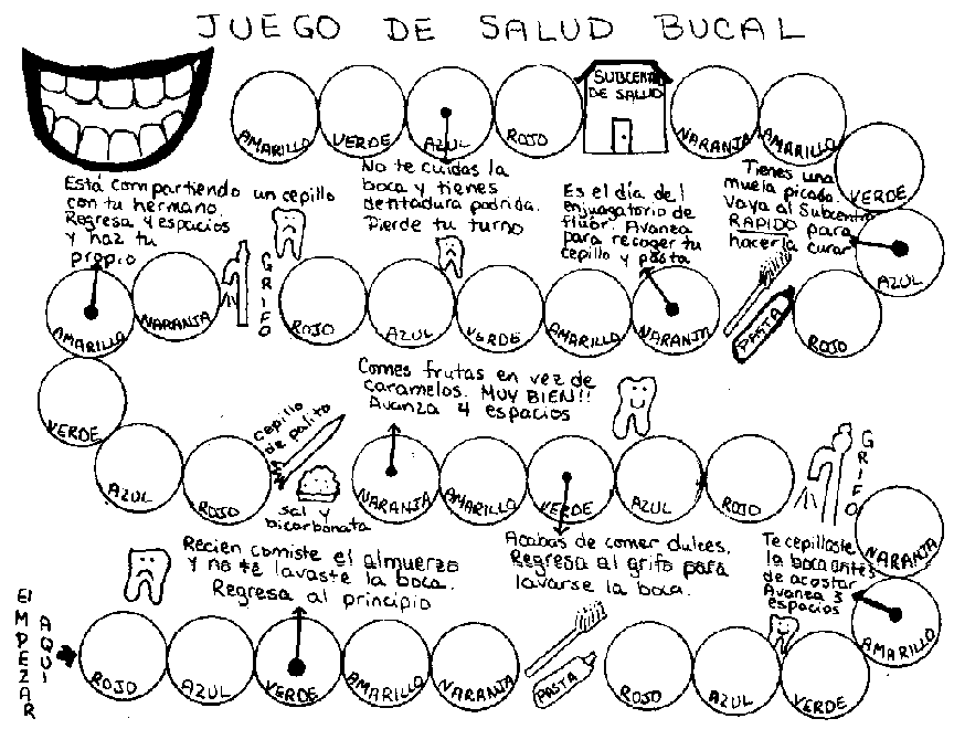 A todos los niños les encantan los juegos y los juegos les ayudan a aprender. En la próxima página, se encuentra "El Juego de Salud Bucal". Este se puede jugar después de una charla sobre Salud Bucal o después de los enjuagatorios de flúor. Se juega en la misma manera del "Juego de Higiene" en la página No. 43. Además de los juegos, se necesitan tarjetas de varios colores y una ficha para cada jugador. (Vea la página No. 42 para direcciones completas). Para participar, los niños deben saber leer, y por eso, es más apropiado para estudiantes de cuarto a sexto grado. El profesor tiene que ayudarles a leer y entender el sentido de los mensajes.