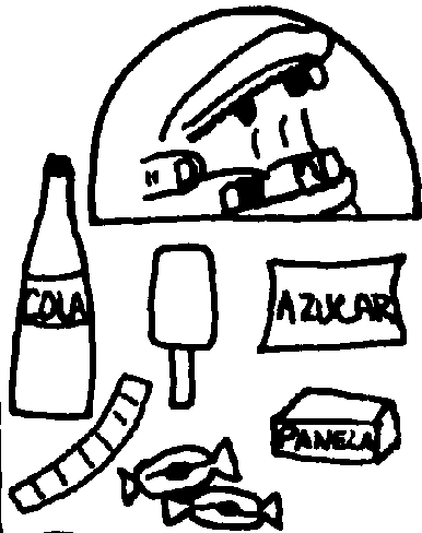 Después de comer, en los dientes y las muelas quedan recíduos de comida. Los microbios que viven en la boca se juntan con el azúcar en la comida, produciendo la caries. Por eso, la comida con mucho azúcar - caramelos, colas, panela - es lo peor para la dentadura.