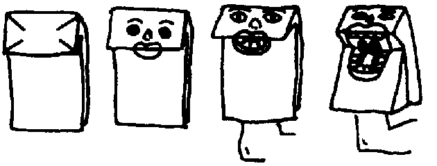 Este tipo de títere es excelente para enseñar dientes, porque se puede hacer mover la boca, abriendo y cerrando la mano. Para hacer el títere más grande, pegue una cara de cartulina a la funda como en Figura B.