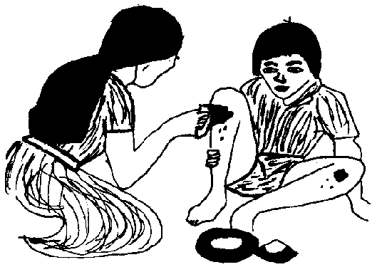 También pueden usar muñecas para practicar tratamiento sencillo para infantes. El profesor puede pintar la muñeca con un poco de achote (para simular sangre). Un estudiante puede curar la herida del infante.