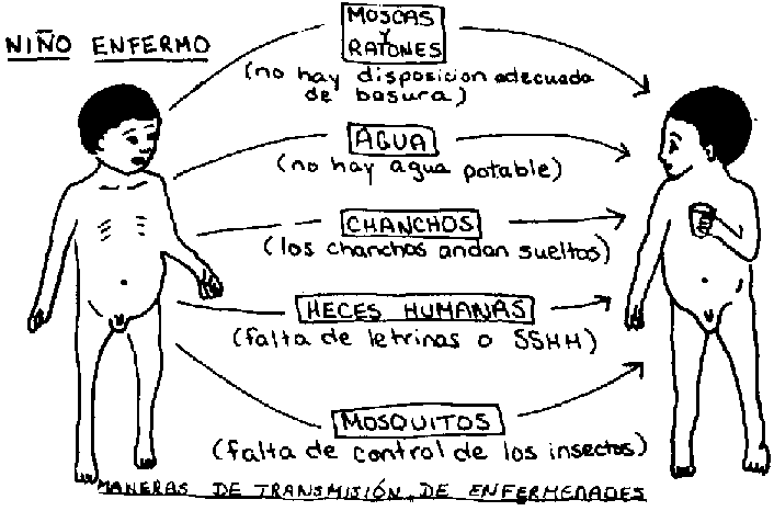 La mayoría de enfermedades viven adentro de una persona y tienen que pasar del enfermo a una persona sana. Hay varios caminos en que se transmiten las enfermedades. Algunos, como contacto directo dependen de hábitos personales (lavarse las manos, tapar la boca al toser, etc). Otros dependen de factores en la comunidad que pueden ayudar o impedir la transmisión de enfermedades. En el siguiente gráfico, están representados los transmisores de enfermedades (agua, moscas, etc.) y factores en la comunidad que ayudan en esta transmisión.