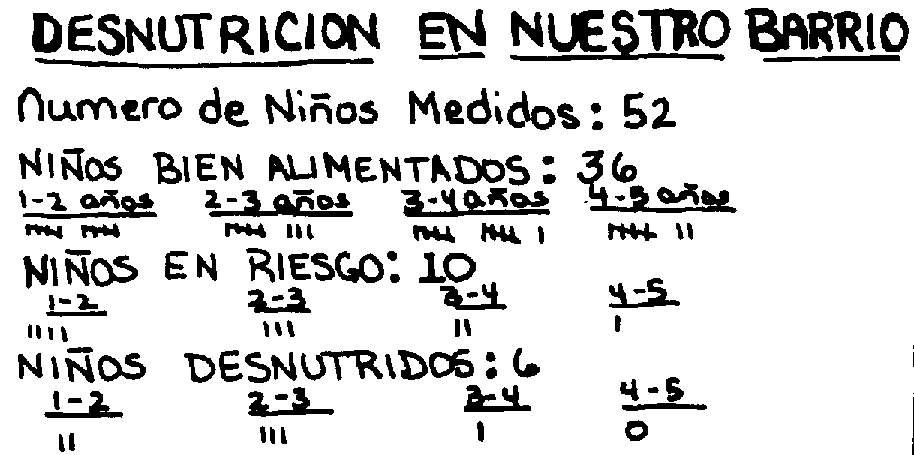 1. Los estudiantes pueden hacer un "estudio de desnutrición" (vea pág. 166) midiendo los brazos de los niños pequeños en la comunidad. Luego pueden explicar a las madres cuales pueden recibir la Leche Avena (vea pág. 146).
