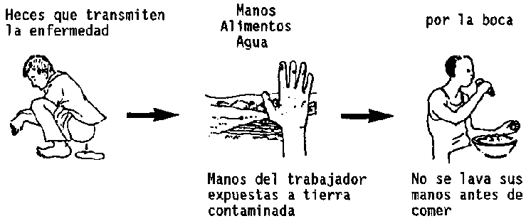 Este tipo de enfermedades se propagan cuando no se dispone de agua suficientemente limpia para bañarse, para lavarse las manos antes de las comidas, después de ir al inodoro, y para lavar la ropa y los utensilios de la casa. Muchas enfermedades comunes caen en esta categoría. La shigelosis (disentería bacilar), la salmonelósis (envenenamiento de las comidas), la tracoma y la escabiosis son enfermedades que pueden transmitirse por contacto directo entre las personas, o por la contaminación directa de alimentos que han sido tocados por manos sucias o por moscas. La Figura No. 2 nos muestra una de las formas como se propaga este tipo de enfermedad. Las enfermedades comprendidas en este grupo propagan de la siguiente manera: