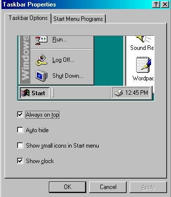taskbar startup options. Always on top and show clock are