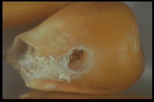 Close-up of Sitotroga damage on maize seeds