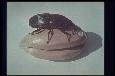 Close-up of female Sitophilus laying egg on wheat