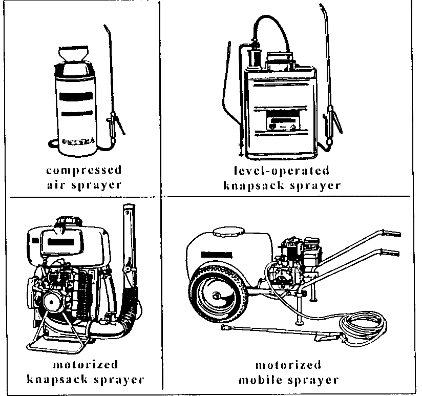 Depending on the height and size of the area being treated, manually operated or motor-driven knapsack or mobile pump sprayers with a capacity of between 10 and 100 litres are used The latter are particularly recommendable for the treatment of the roof area in large stores illustrations of some of the most