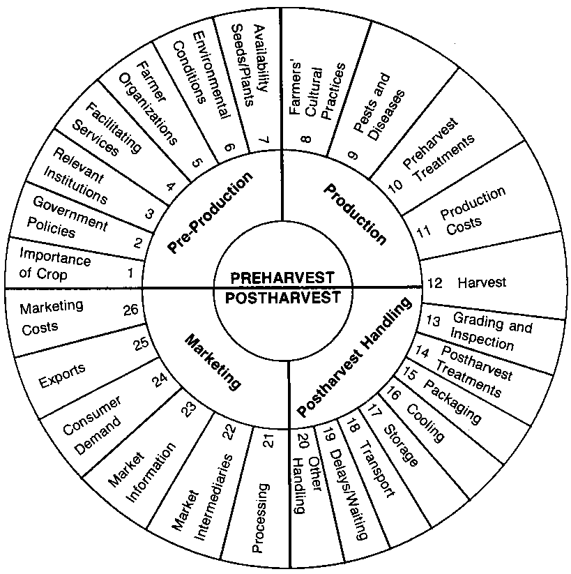 The twenty-six components in Figure 3.1 are presented in a circle format. The center part of the circle is divided in half, identifying those components which fall into the preharvest versus the postharvest stages. Each half-circle is further sub-divided to indicate whether the components deal with