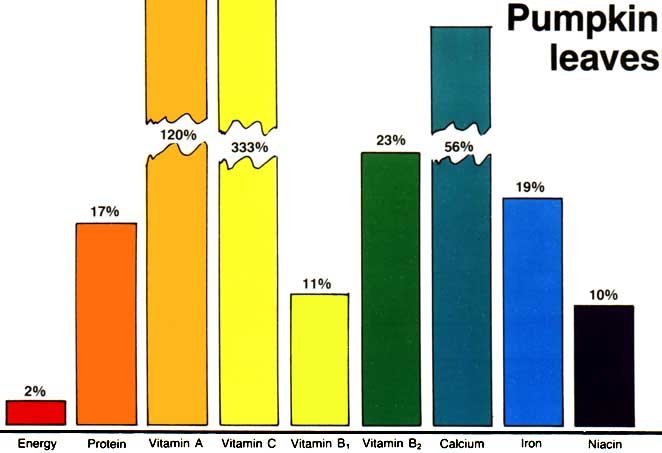 The dark green pumpkin leaves are an excellent source of Vitamin A. The body needs Vitamin A for proper growth, healthy eyes and protection from disease. The leaves are also a good source of calcium, Vitamin C, iron and protein. Calcium helps to make strong bones and teeth. Vitamin C keeps the body tissues strong, helps the body use iron, and helps chemical actions in the body. Iron helps keep blood healthy, and the body needs protein to grow and stay healthy.