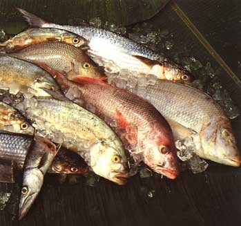 Generally the freshness of fish can be judged by its appearance and smell. First, make sure that the eyes are moist, bright and full, and that the skin is shiny and has the right colour for that type of fish. The flesh must be firm, not soft and slimy, and when pressed with a finger it should bounce back. The gills should be bright red in colour, free from slime and have no strong smell. It is always wise to clean the fish and remove the stomach and gills soon after catching. This will help the fish to stay fresh for some time. Keep the fish in a cool place, preferably a refrigerator.