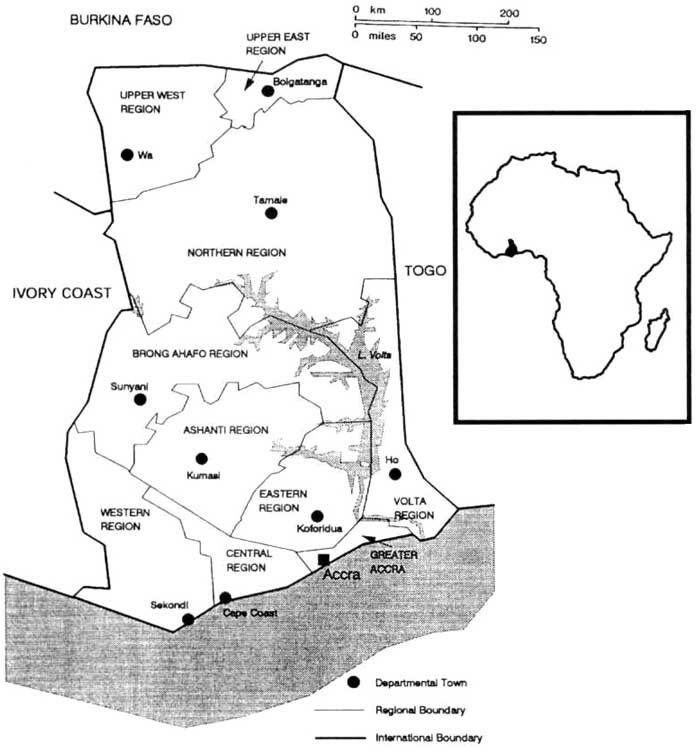 The field survey was carried out in the Republic of Ghana, West Africa. Ghana is bounded on the east by the Republic of Togo, by the Ivory Coast on the west, on the north by Burkina Faso and by the Atlantic Ocean to the south (see Figure 1). Five ecological zones can be described in Ghana: the high rainfall forest (4%), semi-deciduous forest (21%), transitional zone, coastal savannah and northern savannah.