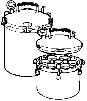 This is a horizontal rotary-type washer for N-cans. The machine is capable of handling cans of sizes N 1-10. Cans are either washed by jets of water or sterilized by steam.