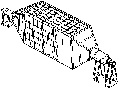 This kiln dryer comprises a drying bin, furnace, and air circulatory systems, and will run continuously for 24 hours. It is used to dry onions at a throughput of 3.3 tonnes/3 days. Dimensions: 360 x 327 x 488cm.