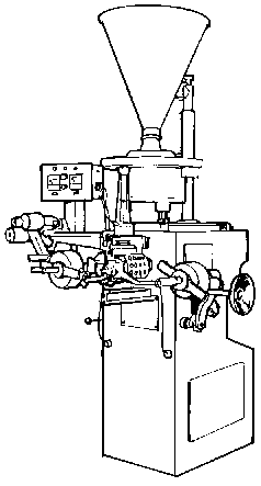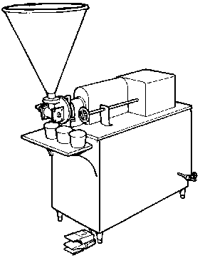 Ravioli can be made easily using this machine in the following way. Two rolled out sheets of dough, each 8.5cm wide, leave the pasta machine to feed the ravioli maker. A container for holding the stuffing is provided. The stuffing is placed manually onto the dough and covered. The process is continuous until the kneaded mixture in the hopper is exhausted. Throughput: 20kg per hour.
