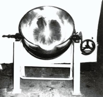 This kettle is designed for fruit processing. Two models are available: the tilting and the fixed type. In the fixed type the stirring mechanism is motorized and teflon scrapers prevent the food charring. Unloading is by an outlet at the bottom of the kettle. The inside is made of stainless steel whilst the outer casing is mild steel. Capacity: 250 litres to 500 litres.