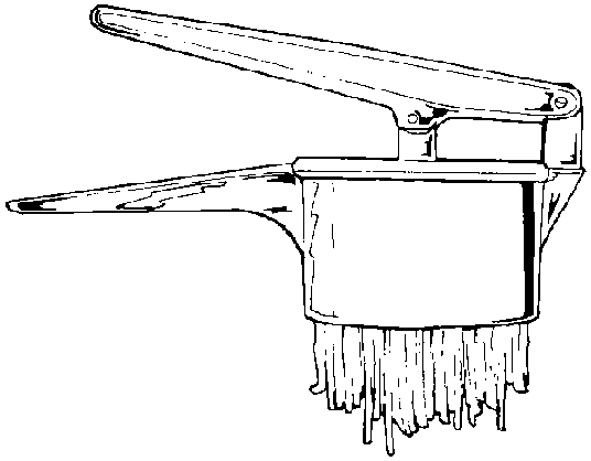 Pineapples can be peeled and cored in the following way. The pineapple is trimmed at both ends and placed into a V-shaped spring-loaded trough as the operator centres the coring tubes. The pineapple is held with the left hand and the manual lever is moved until the coring tube has pierced the fruit. The foot pedal is depressed which raises the stop bar holding the fruit in a coring position. Throughput: 600-720 operations per hour.