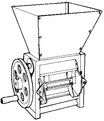 Designed for paddy, this is a compact freestanding model, fabricated from mild steel and operated by cranking a handle, which is connected by pulley and V-belt to the fan.