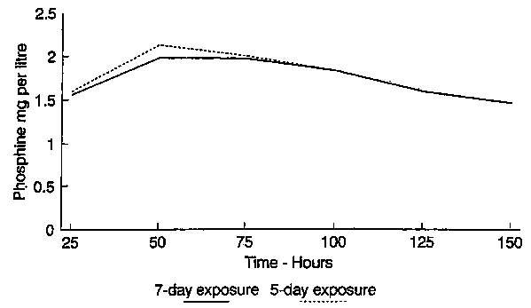 Gas concentrations in mg/l recorded in Dar es Salaam, during fumigations of 100 tonnes of maize using phosphine applied at 2 g/tonnes