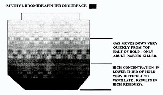 METHYL BROMIDE APPLIED ON SURFACE TRADITIONAL FUMIGATION OF CARGO IN SHIPS HOLD USING PHOSPHINE