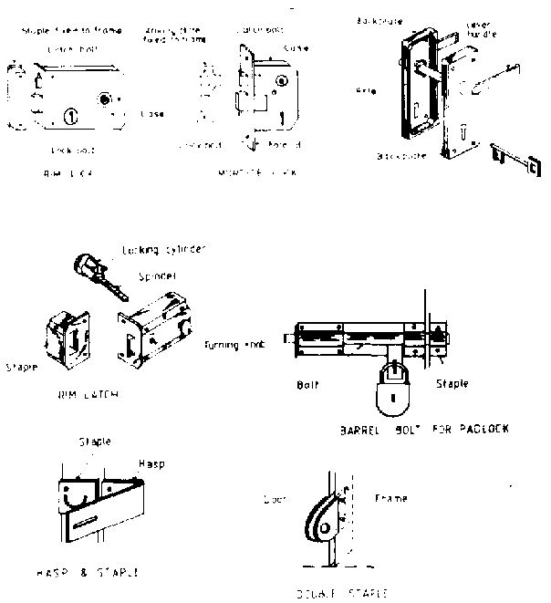 Any device used to keep a door in the closed position can be classified as a lock or latch. A lock is activated by means of a key whereas a latch is operated by a lever or bar. Locks can be obtained with a latch bolt so that the door can be kept in a closed position without using the key. Locks in doors are usually fixed at a height of 1050mm. Some examples of common locks and latches used in farm buildings are illustrated in Figure 3.39.