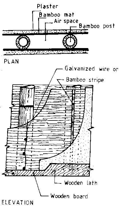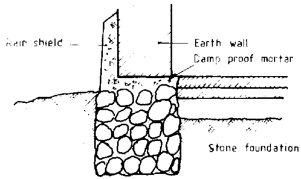 The supporting structure should be generously designed of preservative - treated or termite-resistant timber of poles, and inspected and maintained periodically, as a sudden collapse of this heavy structure could cause great harm. The durability of the mud cover can be improved by stabilizing the top soil with cement, and it can be waterproofed by placing a plastic sheet under the soil. Figure 5.38 and Figure 5.39 shows two types of earth roofs.