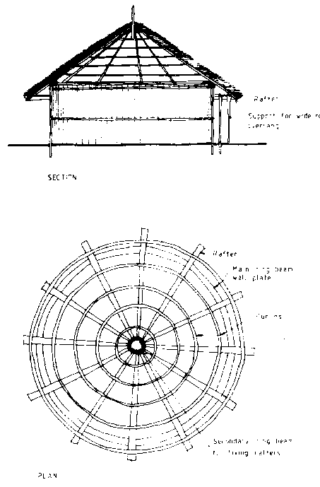 A conical-shaped roof structure requires rafters and purling, and in circular buildings, a wall plate in the form of a ring beam. This ring beam has three functions: