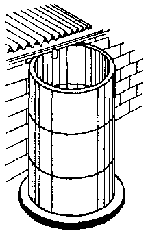 Concrete ring tank sections can be used to form water tanks of about 2,000 litres capacity. The small tank volumes are suitable for rain catchment from small roofs scattered on a compound and for areas with relatively even annual distribution of rainfall. A reinforced concrete cover should be installed. These tanks are particularly suitable where a form can be obtained for community use. With the casting done on site, expensive transportation is avoided.