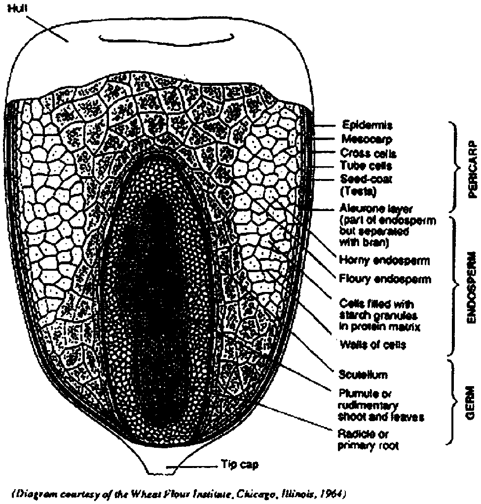 The maize kernel is known botanically as a caryopsis; a single grain contains the seed coat and the seed, as shown in Figure 1. The figure also shows the four major physical structures of the kernel: the pericarp, hull or bran; the germ or embryo; the endosperm; and the tip cap (dead tissue found where the kernel joins the cob). The gross anatomy and the microscopic structure of these anatomical components were well described by Wolf et al. (1952) and by Wolf, Khoo and Seckinger (1969). They also studied the structure of the improved opaque-2 maize and found differences between its endosperm and that of common maize. The protein matrix was thinner and there were fewer and smaller protein bodies, since there is a restriction in zein synthesis in opaque-2 maize. Robutti, Hoseny and Deyoe (1974) and Robutti, Hoseny and Wasson (1974) reported on the protein distribution, amino acid content and endosperm structure of opaque-2 maize.