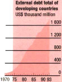In 1994, the developing countries as a whole owed an estimated US$ 1 800 000 million to banks, governments and multilateral institutions in the industrialized countries-the equivalent of half their entire annual trade. Servicing these huge debts diverts funds from urgently needed social and economic development.