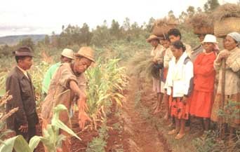Members of the village committee of Ankofafa, Madagascar, inspect the results of community anti-erosion measures. |