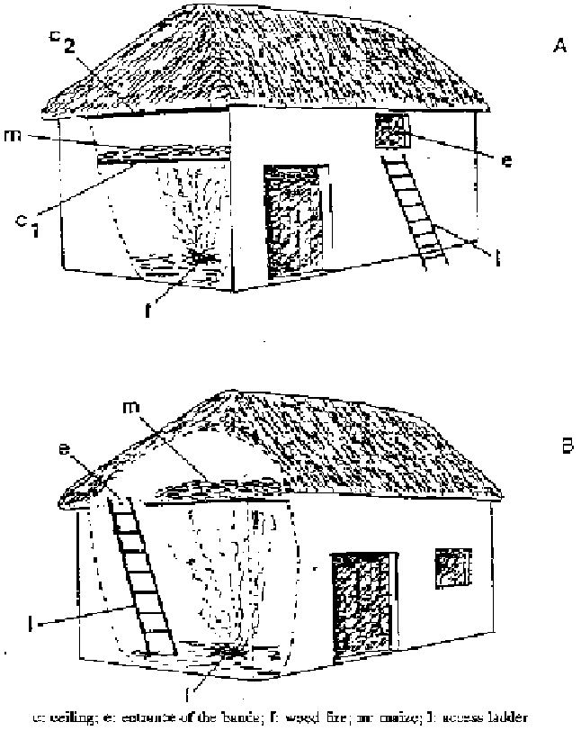In the north west of Cameroon corn cobs, partially husked, are carried in baskets to the homestead and placed in a bed 30-40cm thick inside a structure called a "banda". The banda is the space above the ceiling of the kitchen (Figure 4.1). The base of the banda on which the cobs lie consists of an assembly of bamboo rails a few centimetres apart with an opening 60cmx60cm to provide access to the interior.