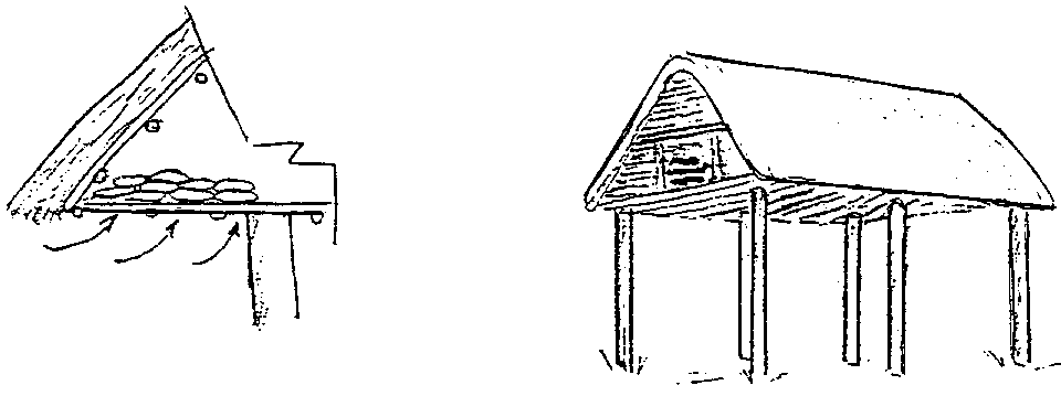 Experience at the African Rural Storage Centre (Ibadan, Nigeria) have led to the design of a narrow structure called a "crib" (Figure 4.5) where maize with a high moisture content (30%) harvested when ripe, may be stored conveniently. The width of the crib should not be more than 60cm in a humid climate to avoid fungal attack. The walls are made from grilles or vertical rails of wood, bamboo or palm frond stems (3-5cm thick). A roof ensures supplementary protection from the rain.