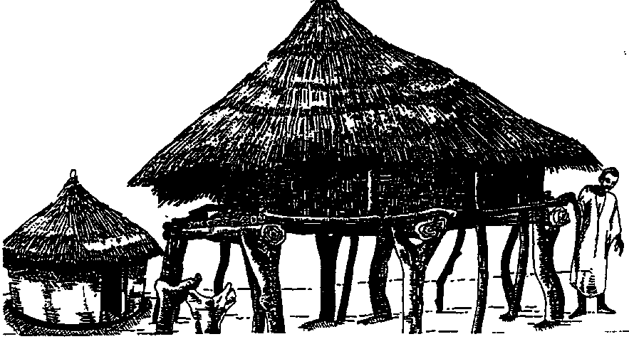 Figure 5.1- Traditional granaries of woven plant fibres (Source: FAO Bulletin N° 69) (a) Traditional granary of the Mossi and Gourmantché (Burkina Faso), for storage of cereals in ear. Platform on rocks. Granary of reed mats (plaited stems of Andropogon)