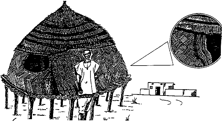Figure 5.2 - Djerma Granaries in Niger (roof and walls a single assembly composed of superimposed layers of millet stalks, reed mats and grass straw) (Source: FAO Bulletin N° 69)