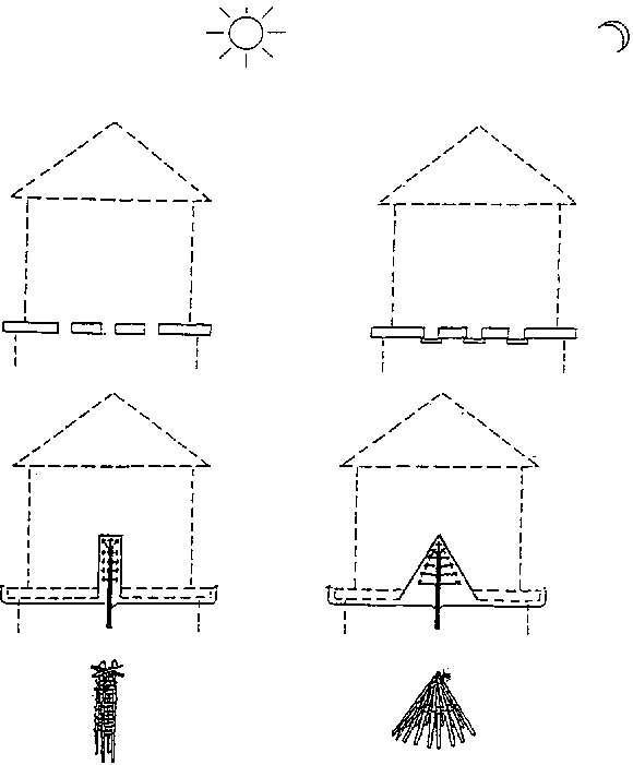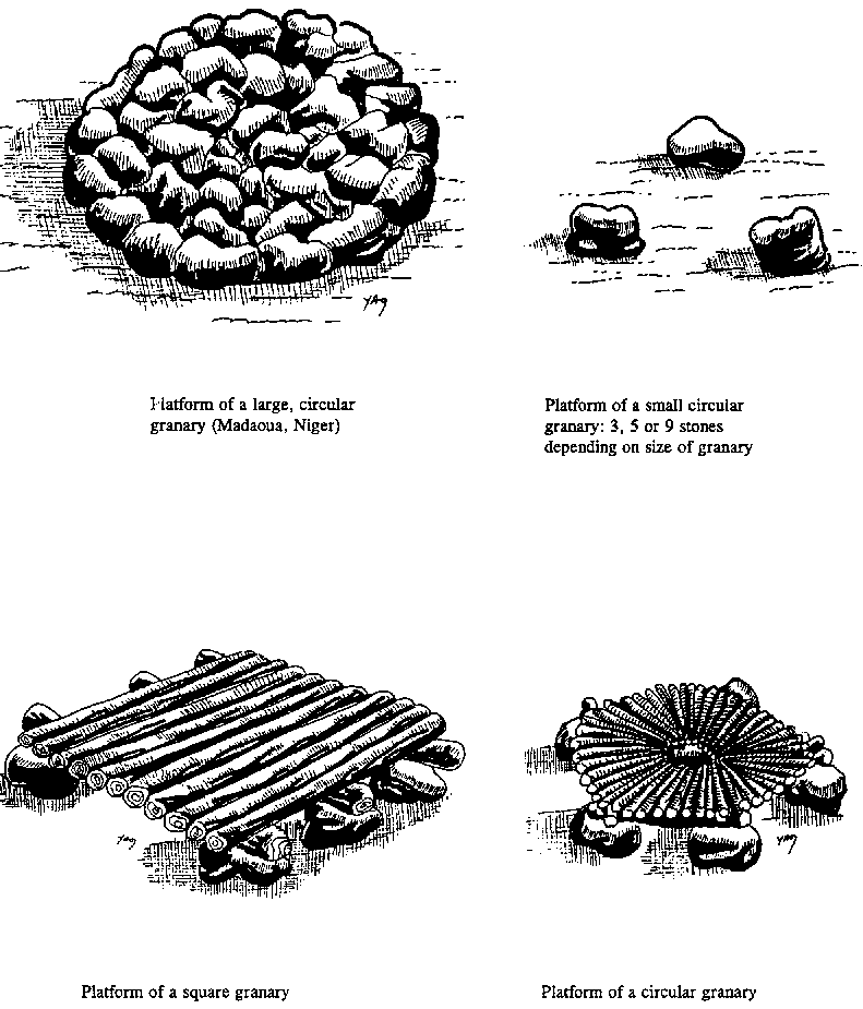 For a square-section granary, the platform consists of a base of six large stones supporting, normally, three main beams across which are laid the wooden floor beams (figure 5.3). When the section is circular, the platform is based on either a circular bed of stones or a circle of stones around a central stone. Very short beams placed between the stones carry floor beams laid out as spokes of a wheel. These different types of platform are used for large granaries (8 - 12m3 up to 60m3 among the Hausa of Niger). For small granaries (0.5 to 2m3) notably among the Gourmantché of Burkina, the platform is made on a base of 3, 5 or 9 stones in a circle. The height from the ground never exceeds 30cm.