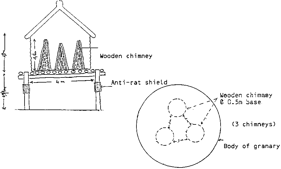 Figure 5.8 - Maize granary fitted with three conical chimneys in wood distributed evenly across the floor to improve air circulation (Source: Afomasse, 1994)