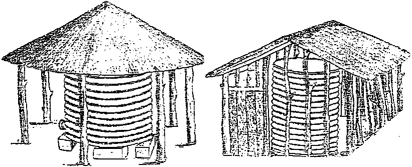 For 25 years attempts have been made to introduce "improved" silos, either to modify part of a traditional silo (floor or walls), or to replace a straw silo (Figure 5.10). Aboveground silos in timber, brick or concrete and underground silos present characteristics, of airtightness for example, adequate for good control of insects by fumigation. Nevertheless, the rate of adoption of improved techniques has often been feeble for various reasons (see the beginning of Part 2 of the chapter), notably: poor availability of construction materials, insufficient technical knowledge and the need for supplemental drying.