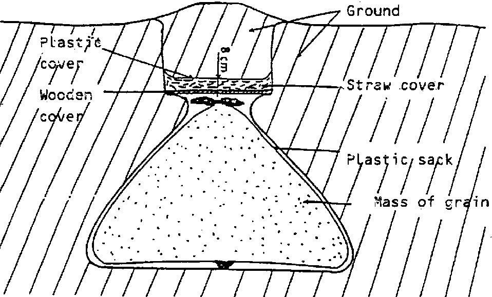 Traditional small, closed grain stores are used by farmers all over Africa. They include underground silos, walled silos and above-ground structures made from clay, often mixed with a strengthening material, notably straw or cow manure. They are found in regions where the hydrometric air conditions, at harvest time, easily permit grain moisture content to be lowered to 12% (or less) for good silo storage (Figure 5.9).